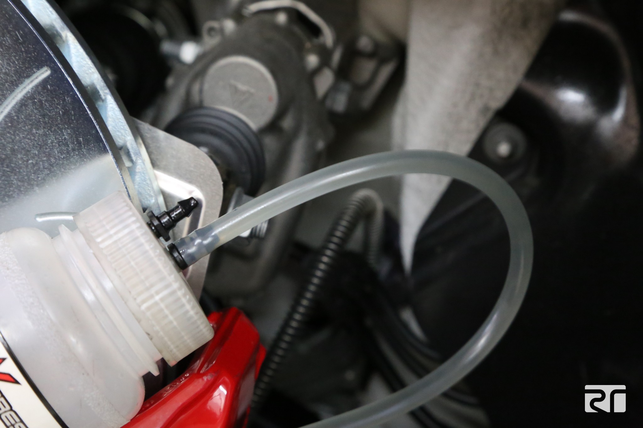 Once the Brembo performance 2-piece disc assemblies and RT pads were installed on all four corners, the OEM brake fluid was flushed and bled with Brembo Racing HTC64T brake fluid. As the fluid was being bled on each corner, GMG made sure to keep an ample amount of new fluid filled in the master cylinder reservoir to ensure that air did not enter into the hydraulic system.